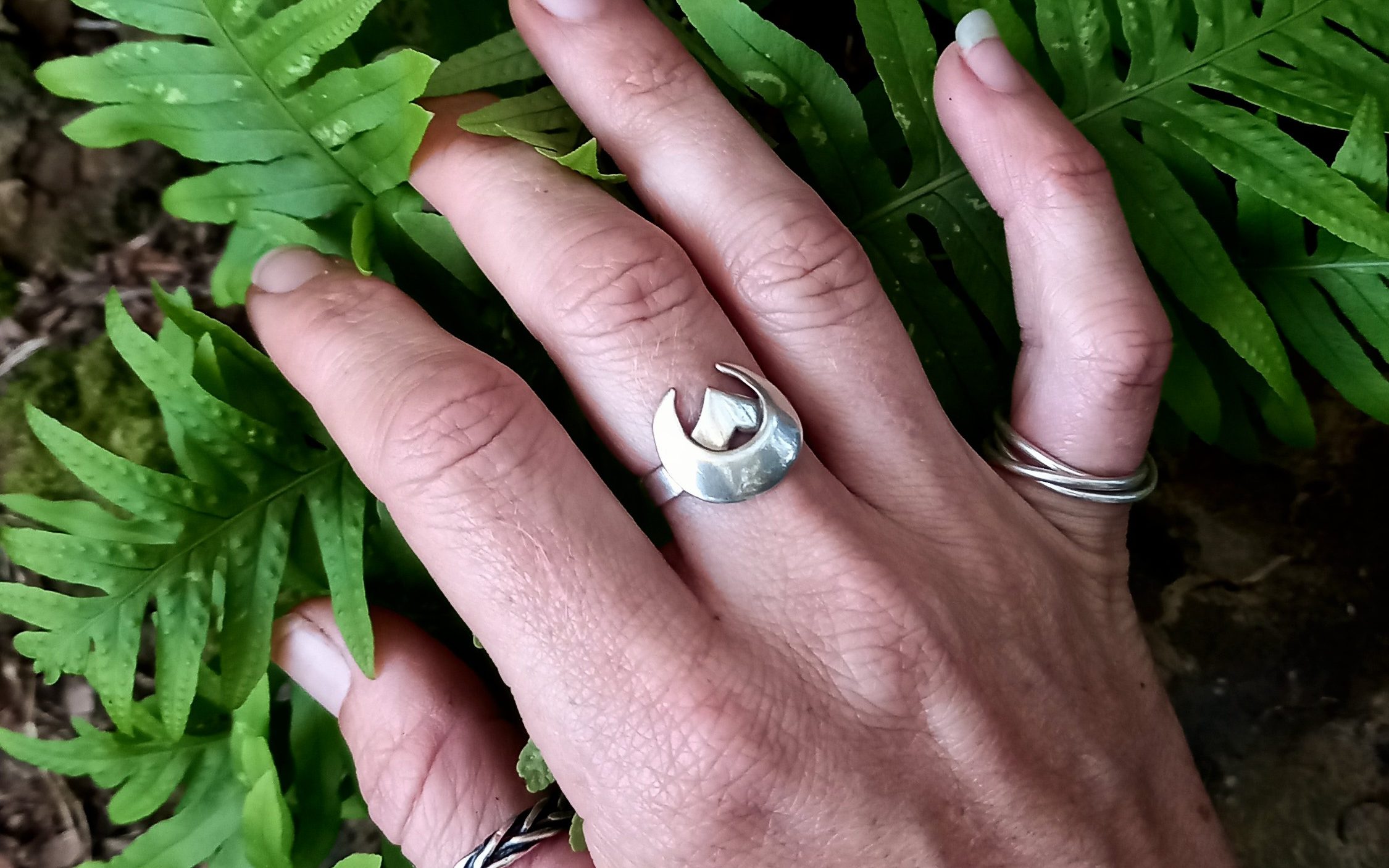 I also wear several lunulae – amulets in the shape of a crescent moon. Traditionally these were worn by Roman girls as a means of protection against evil spirits. Alongside their protective nature, I personally find them to bring me into stronger communion with the Moon and her cycles, bringing me time and time again into connection with the cyclical rhythm of all things. These amulets are imbued with intentions of protection, patience, and peace.