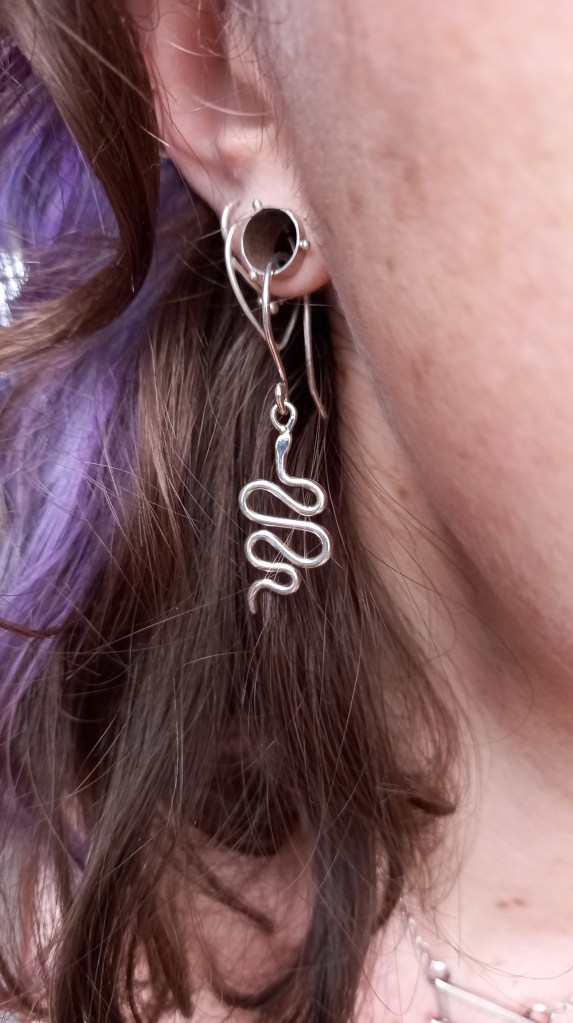 The snake theme continues with these matching dangly snake earrings – elegant and edgy at the same time.